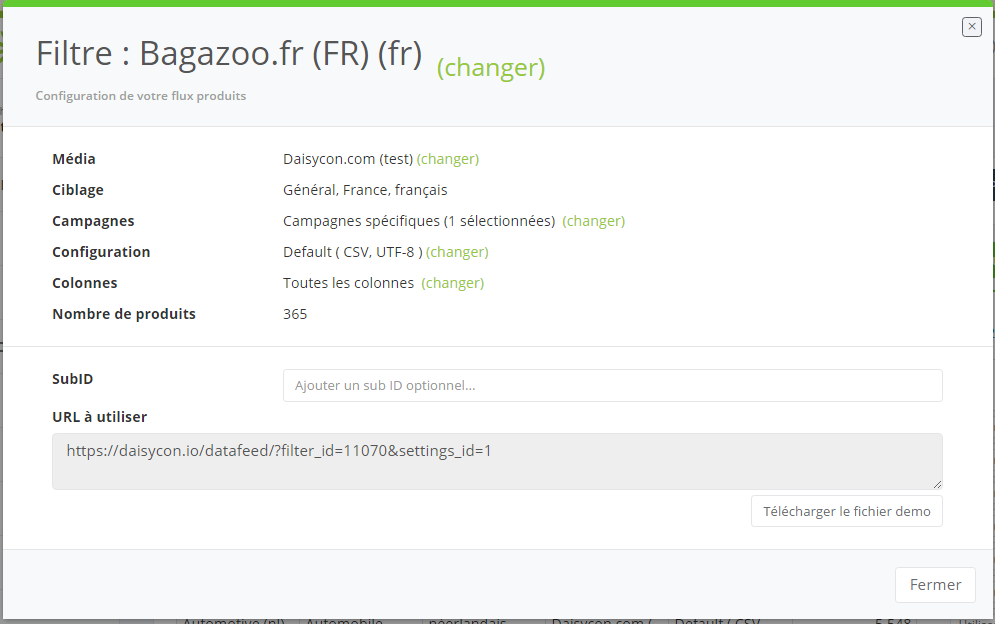 Pour chaque flux personnalisé crée vous avez la possibilité de récupérer une URL personnelle vous permettant d’avoir les informations produits mises à jour régulièrement ou éventuellement télécharger un export du flux produit dans le format souhaité !